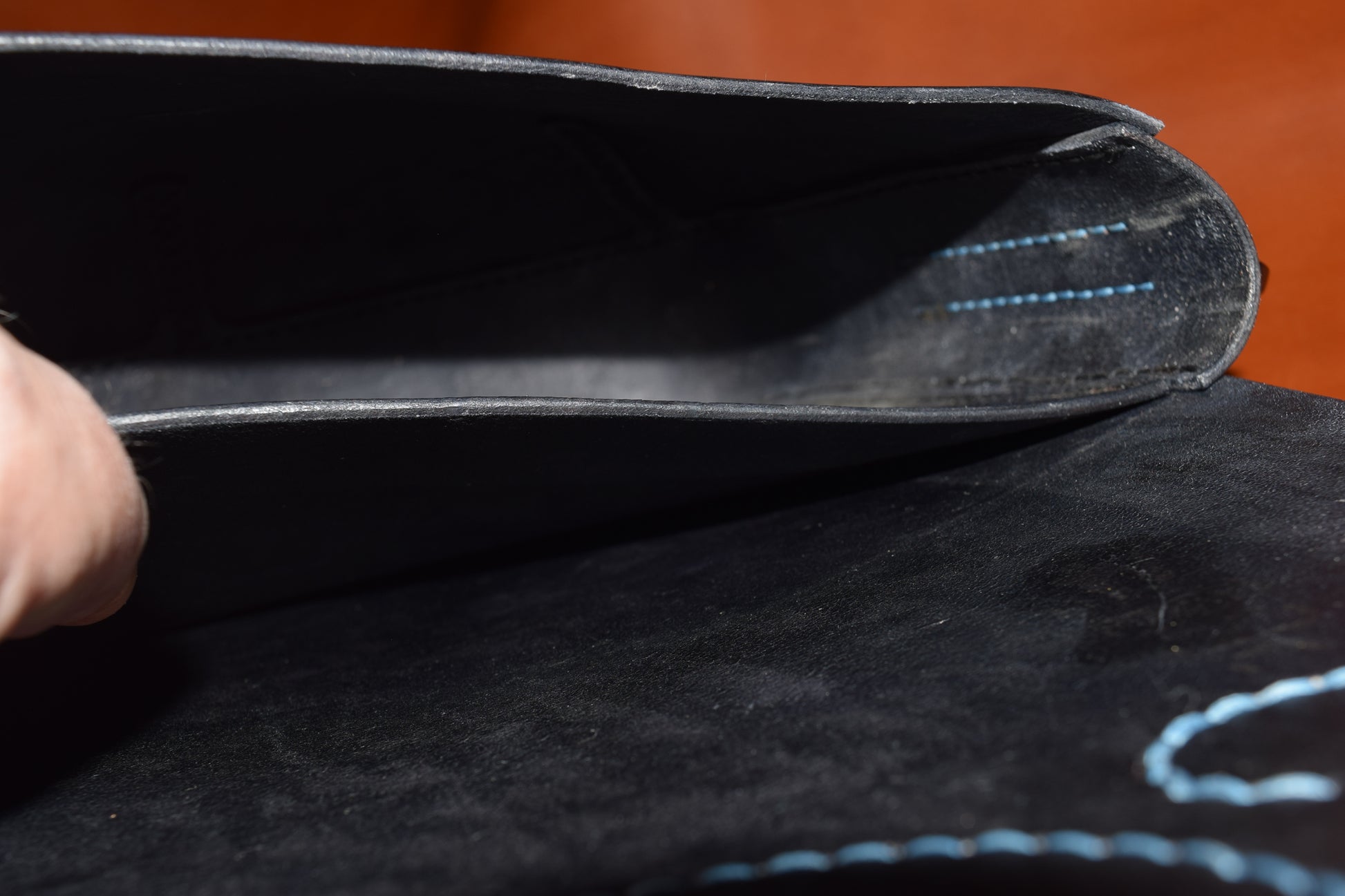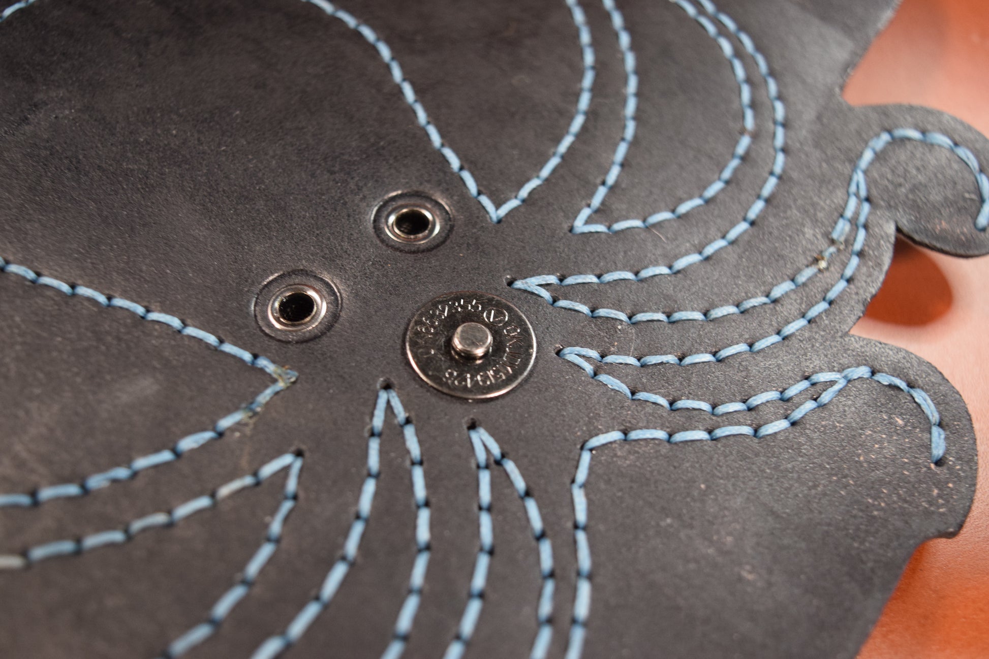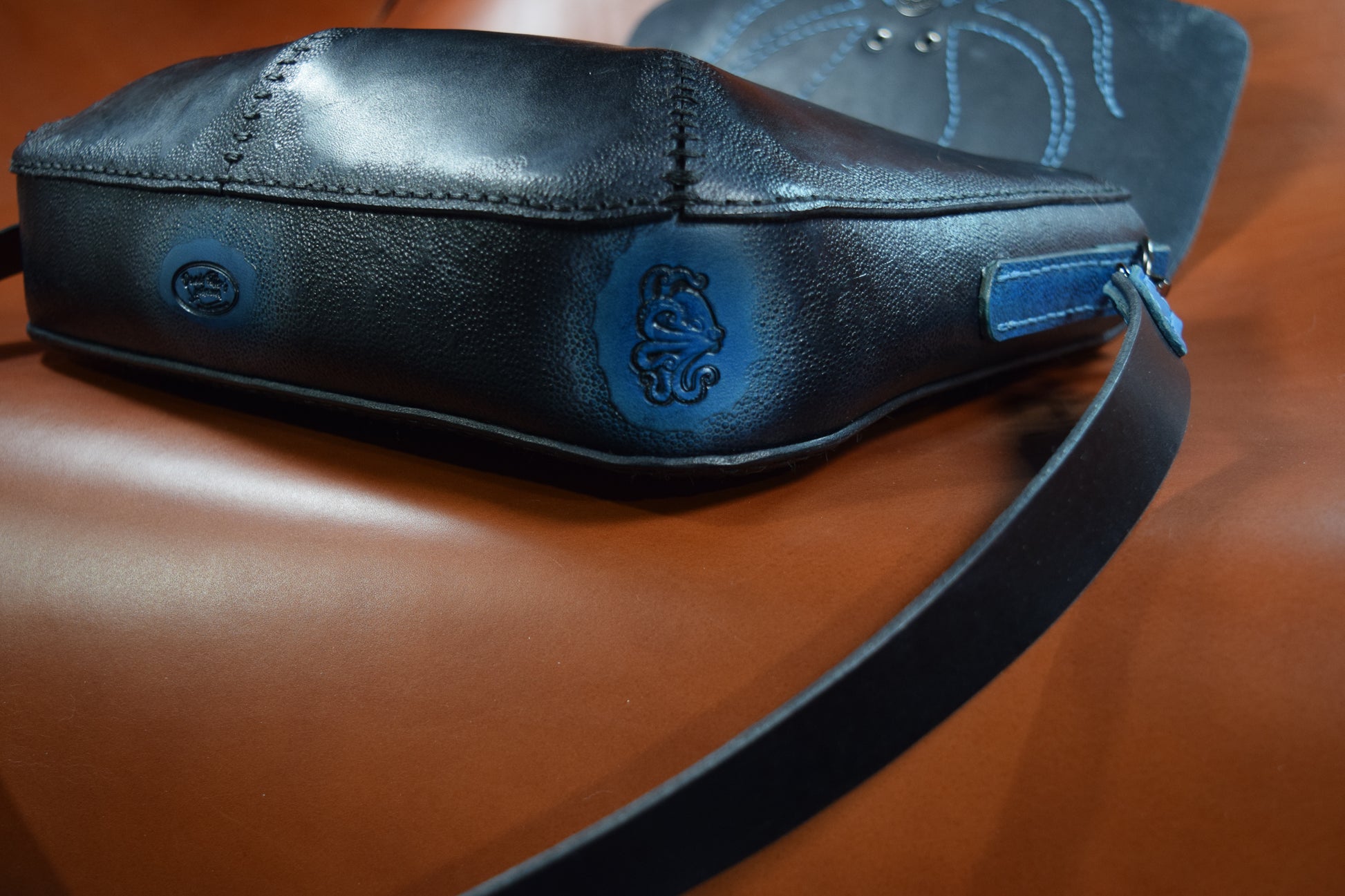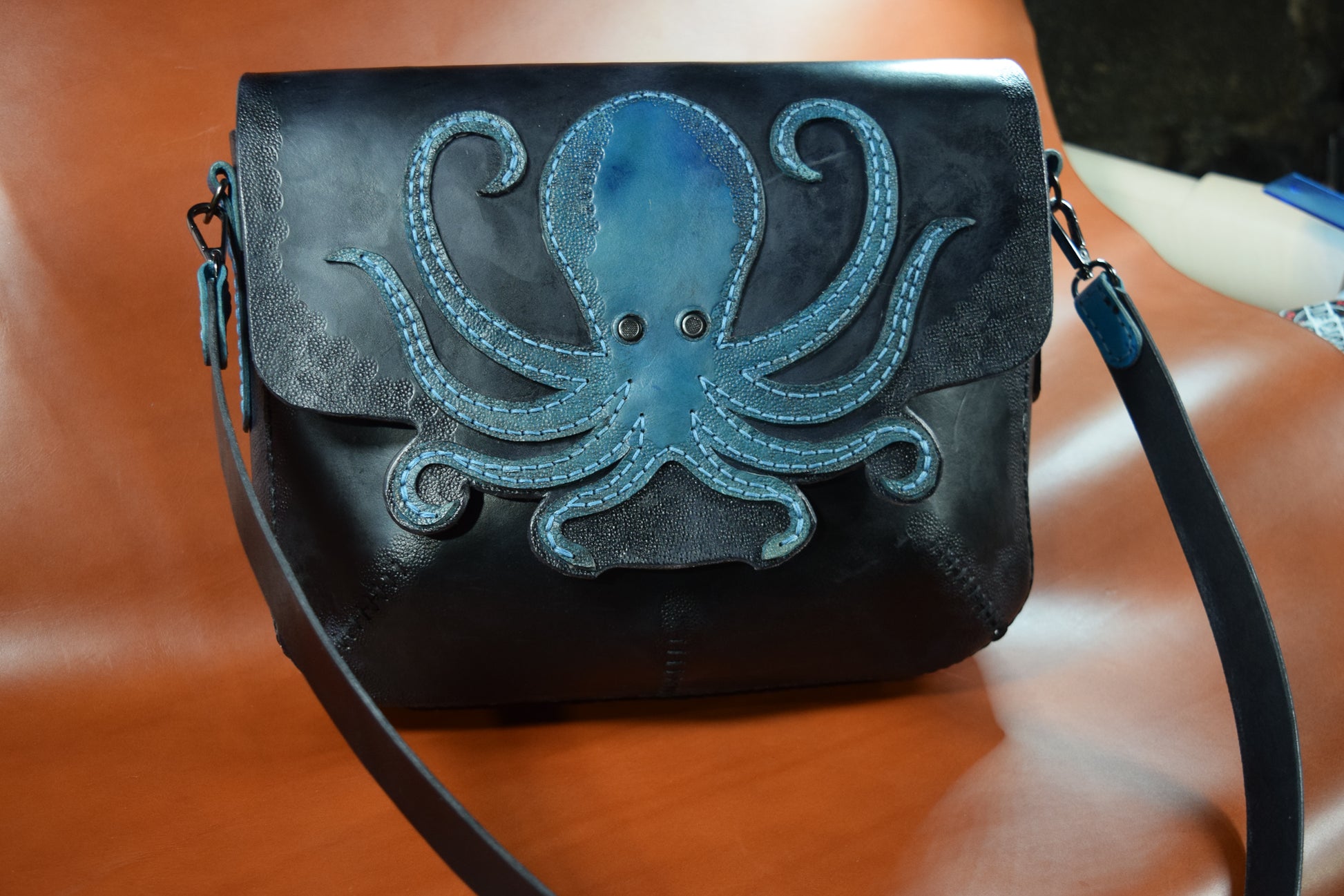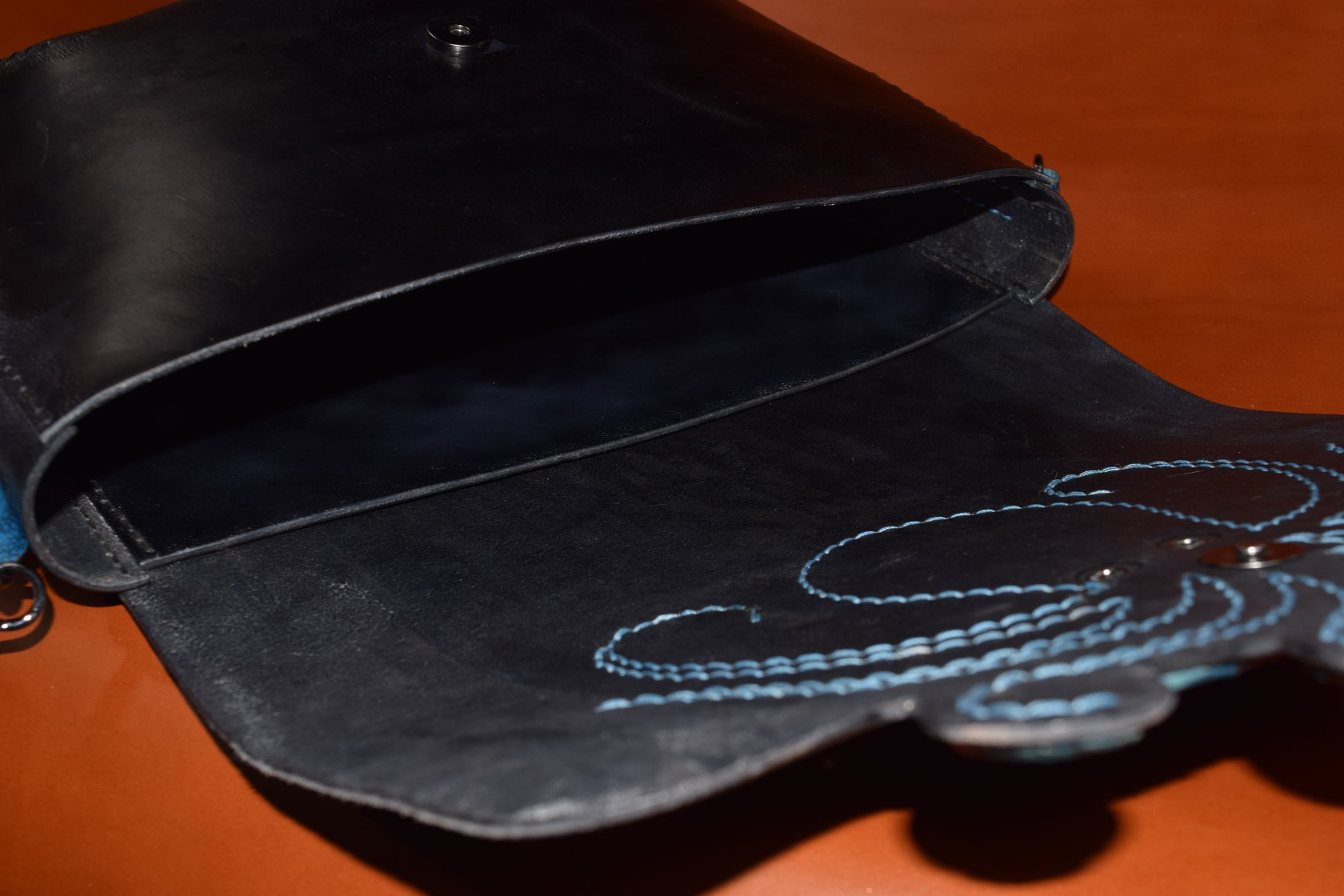 Leather octopus purse with rear pocket inside. Magnetic clasp for the closure and an adjustable shoulder strap. All our leather products are handmade. Choose your color between blue and purple for the accents and octopus.