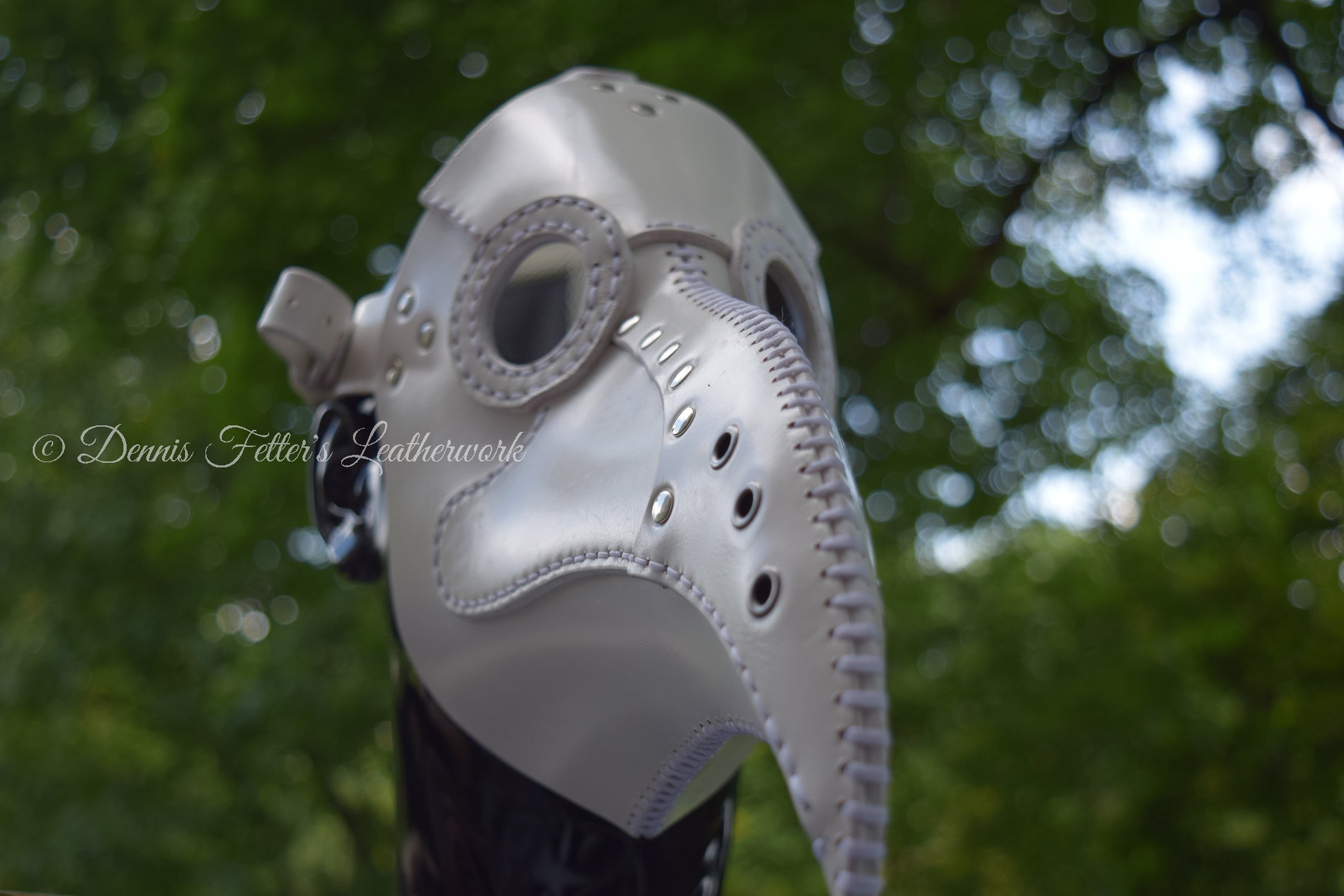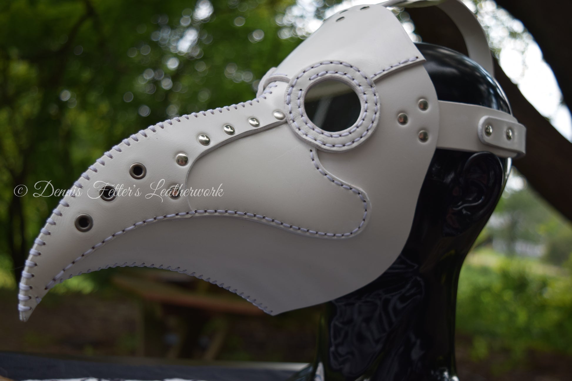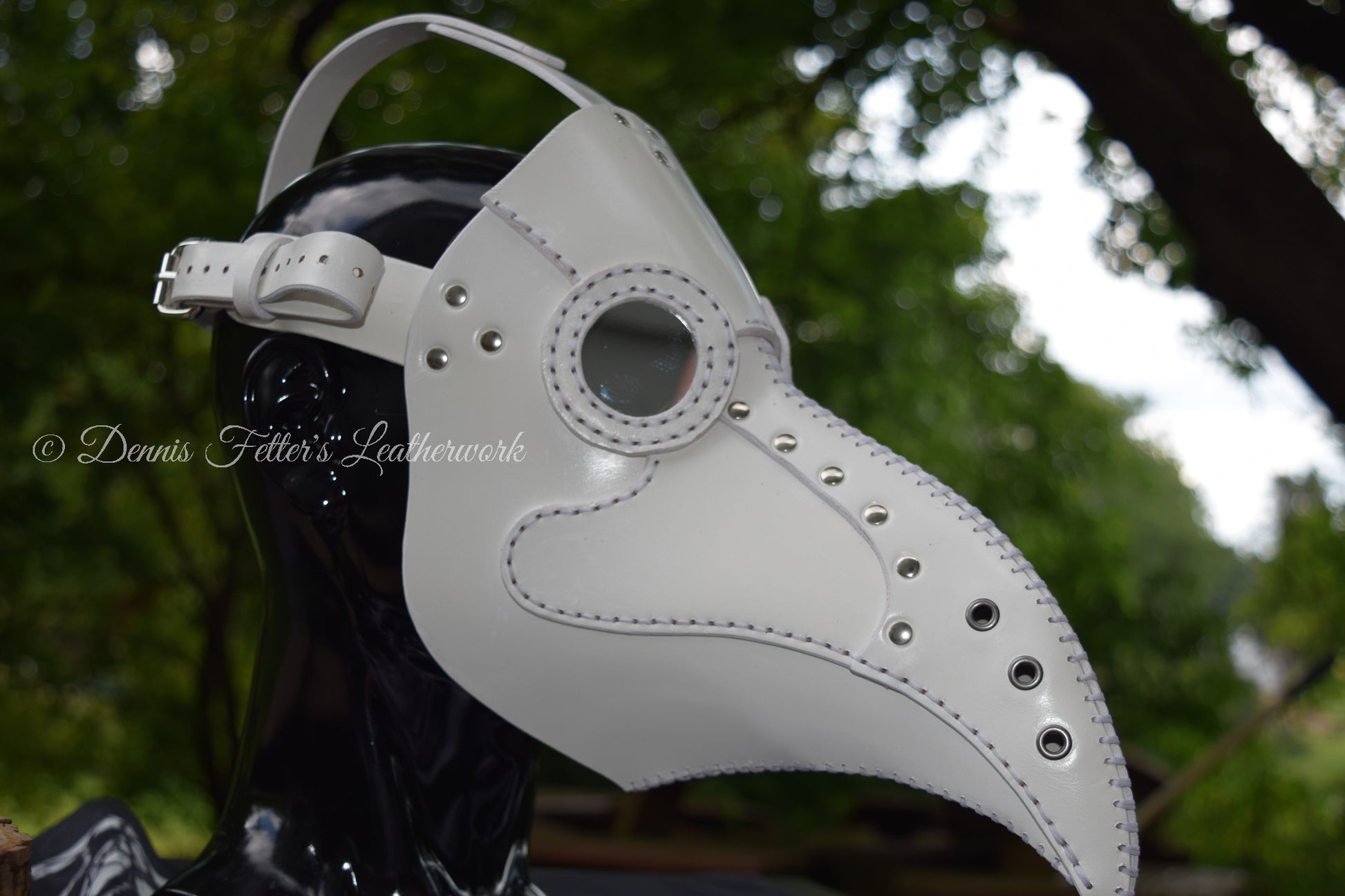 This is a unique and rare white leather plague doctor mask. The plague doctor was a historical figure who treated victims of the Black Death. This mask is a replica of the mask he would have worn. This is a perfect Halloween costume or cosplay accessory. It can also be used as a prop for theater or film. The mask comes with several lens color options.